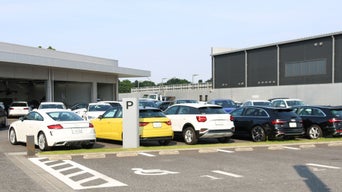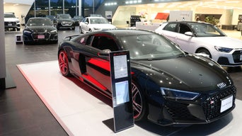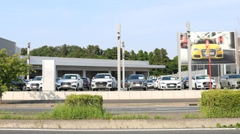 ショールームには最新のアウディモデルが展示され、大型モニターにはAudiの魅力を伝える映像が流れています。隣接する敷地には、認定中古車も展示中。