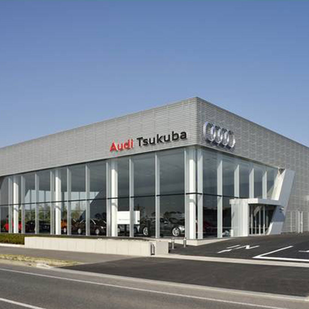 Audiつくば のショールームは、最新のアウディCIの「ターミナルコンセプト」に基づき、外観にアルミ材によるハニカムパネルファサードを採用、内装はホワイトとグレーのモノトーンで統一されています。